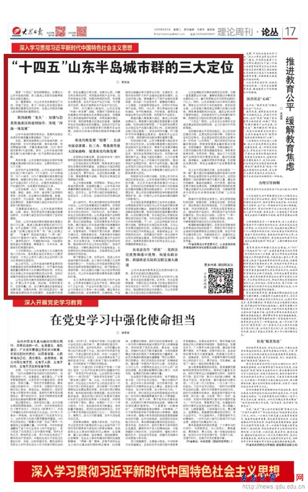 新聞網(wǎng)訊 6月1日,我校黨委書記胡金焱在《大眾日?qǐng)?bào)》發(fā)表理論文章:“十四五”山東半島城市群的三大定位”。文章指出:國家“十四五”規(guī)劃綱要提出,發(fā)展壯大山東半島城市群,深入推進(jìn)山東新舊動(dòng)能轉(zhuǎn)換綜合試驗(yàn)區(qū)建設(shè)。為山東未來發(fā)展謀劃了方向、找準(zhǔn)了定位。文章分析山東未來要通過發(fā)揮黃河戰(zhàn)略“龍頭”優(yōu)勢(shì),加強(qiáng)與沿黃其他省區(qū)的密切協(xié)作,實(shí)現(xiàn)“河海一體發(fā)展”;以南北均衡發(fā)展“紐帶”為重要任務(wù),主動(dòng)對(duì)接京津冀、長三角、粵港澳等重大國家戰(zhàn)略,促進(jìn)南北均衡發(fā)展;通過東北亞合作“橋梁”作用,發(fā)揮區(qū)位優(yōu)勢(shì)和港口優(yōu)勢(shì),構(gòu)建東聯(lián)日韓、西接歐亞大陸的互聯(lián)互通大通道。這是實(shí)現(xiàn)山東區(qū)域協(xié)調(diào)發(fā)展的重要任務(wù)和目標(biāo),也是山東服務(wù)和融入新發(fā)展格局的重要路徑。