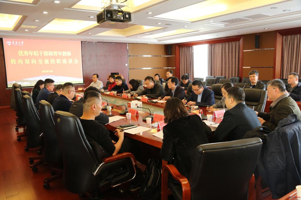 新聞網(wǎng)訊 11月30日下午,學校在辦公樓407會議室召開優(yōu)秀年輕干部和青年教師校內(nèi)雙向交流掛職工作座談會。黨委書記胡金焱出席會議并講話。黨委常委、組織部部長徐龍飛主持會議。