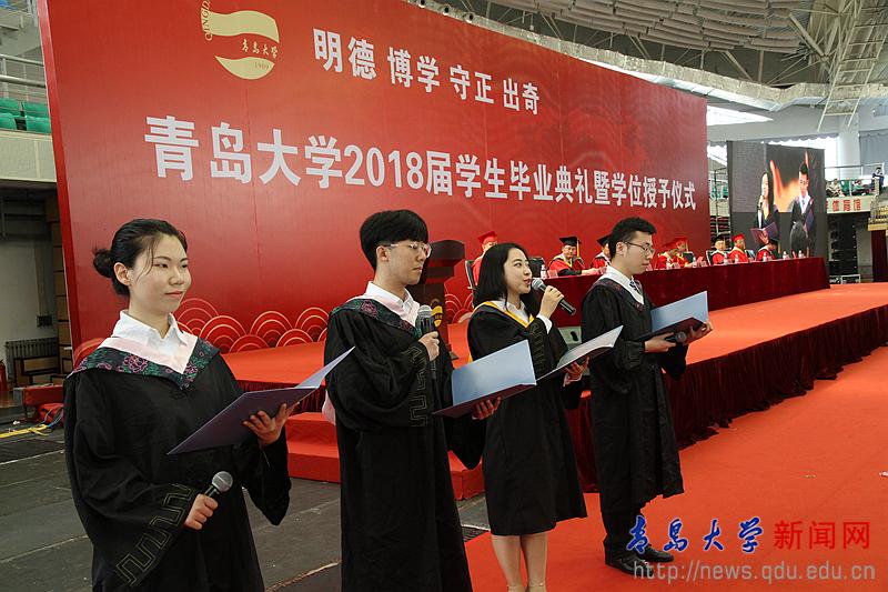 畢業典禮上,校學位評定委員會副主席、校黨委常委、副校長于永明宣讀了《青島大學2018年夏季關于授予博士、碩士學位及學士學位的決議》。校黨委常委、副校長邵彬宣讀了《青島大學關于表彰2018屆優秀博士、碩士、學士學位論文獲獎得者的決定》。校黨委副書記杜方波宣讀了《青島大學關于表彰2018屆優秀畢業生的決定》,胡金焱、儀垂杰分別為優秀畢業生代表和優秀論文獲得者代表頒發了證書。