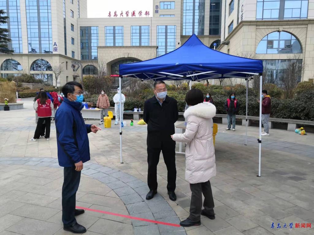 在新設立的浩園核酸檢測點,校黨委常委、紀委書記、省監委駐青島大學監察專員范玉斌詳細了解了公共衛生學院師生在醫學部、后勤管理處、安全保衛處、網絡中心、校醫院等單位的大力支持下,24小時內建成新點并正常運行的情況。他鼓勵師生們再接再厲、昂揚進取,在今后的學習、工作中收獲更多的成果。