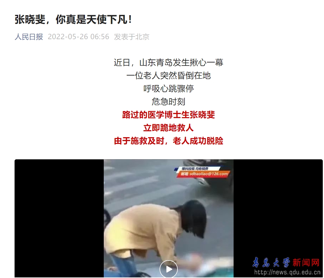 新聞網訊 近日,青島電視臺生活在線節目播出了一段視頻,視頻中一位女生跪地救助一位倒地昏迷老人,她一直為老人實施急救直至急救車到來。急救現場,她嫻熟、專業的急救操作和敬畏生命的職業素質得到了現場民眾的高度稱贊。經多方了解,圖片中這個學生為青島大學醫學部2018級消化內科學博士研究生張曉斐。