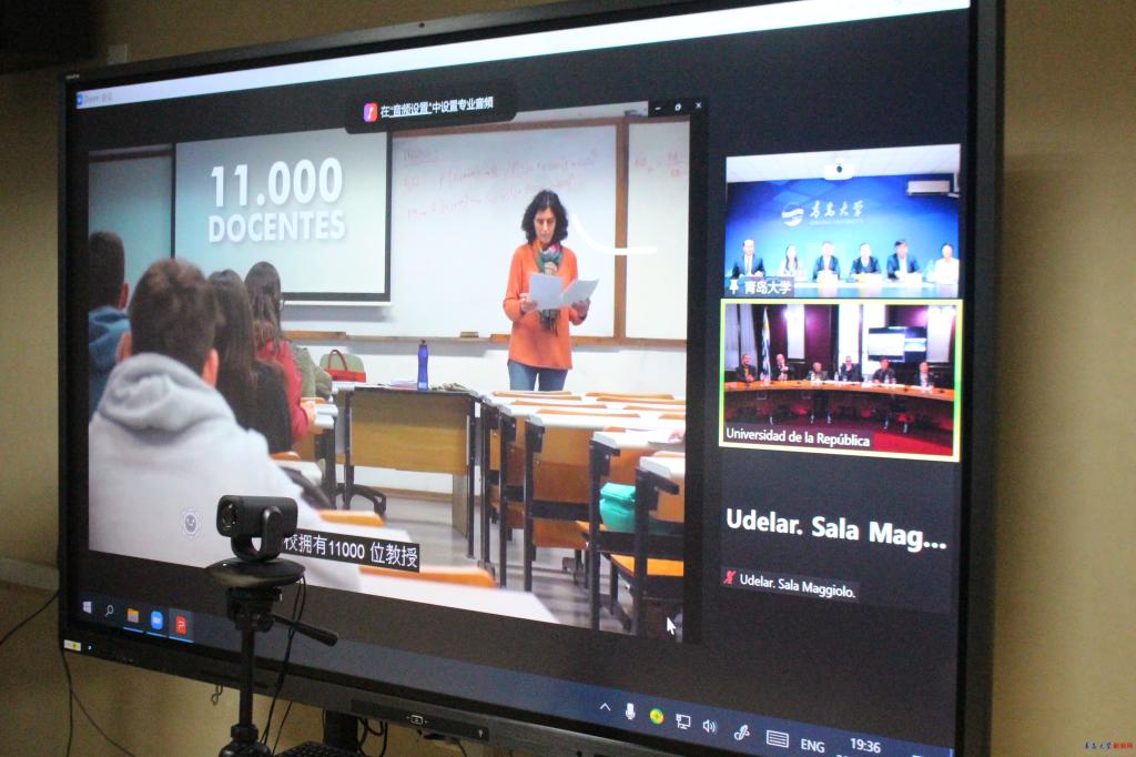 夏東偉在致辭中對阿里姆校長和烏方參會人員表示問候,介紹了學校的歷史沿革、人才隊伍、人才培養、學院設置、學科專業建設和對外交流合作等情況。羅德里戈·阿里姆校長在致辭中也表達了對夏東偉校長和中方參會人員的問候,簡要介紹了共和國大學辦學歷史等相關情況,并對孔子學院的工作給予了充分肯定。雙方共同觀看了青島大學和烏拉圭共和國大學的宣傳片。