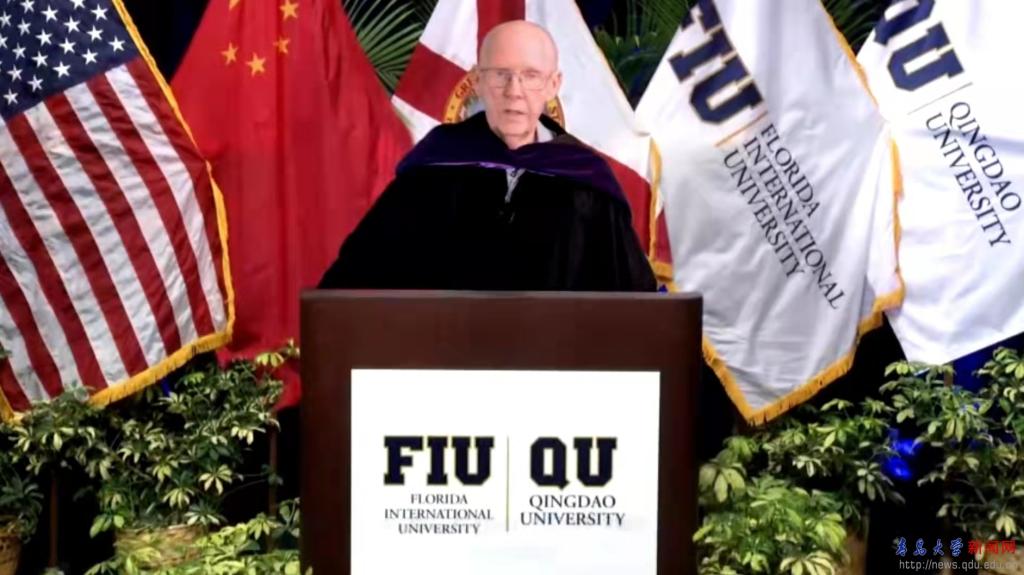 夏東偉在致辭中首先向圓滿完成學業(yè)的畢業(yè)生們表示祝賀,并向付出了辛勤勞動的兩校教職員工和關(guān)心支持青島大學的社會各界朋友表示衷心感謝。他介紹了青島大學的辦學特色和所得成就,以及與佛羅里達國際大學聯(lián)合舉辦西班牙語專業(yè)(拉美貿(mào)易方向)本科雙學位教育項目的合作辦學歷史。并對本屆畢業(yè)生寄予了殷切的期望:第一,堅守與時代同脈的高遠理想,心系民族命運,關(guān)注國家大事,在實現(xiàn)民族復興的宏偉事業(yè)中奉獻自己的青春年華;第二,厚植與時代同行的家國情懷,注重修身齊家,強化責任擔當,在實現(xiàn)新時代的夢想中譜寫無悔的青春之歌;第三,練就與時代同進的過硬本領(lǐng),變革思維方式,提升能力本領(lǐng),在實現(xiàn)青春夢想中展示絢麗多彩的人生才華;第四,成為世界文化交流的推動者,發(fā)揮專業(yè)所長,為建設人類命運共同體的偉大夢想貢獻自己的力量。最后,夏東偉校長祝愿每一個畢業(yè)生都能勇往直前,鵬程萬里,不辜負這個偉大的新時代,也祝愿兩校友誼天長地久,合作再結(jié)碩果。