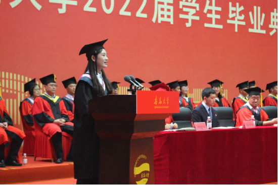 “青春之先鋒”——外語學(xué)院2022屆本科畢業(yè)生蔡雨湉作為畢業(yè)生代表發(fā)言,講述了自己成長為一名“斜杠青年”的心路歷程,表示青年人要走出“舒適圈”,到黨和人民最需要的地方去,讓青春與祖國雙向奔赴,做偉大理想的追夢人,做最幸福且酣暢的奮斗者,書寫不負時代、不負黨和人民的青春答卷。