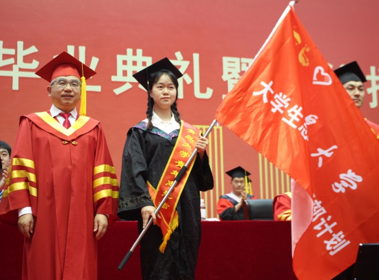 典禮上,胡金焱為2022年“西部計劃”志愿者代表授旗、授章,鼓勵青年學(xué)子到西部、到基層,到祖國和人民最需要的地方建功立業(yè)。夏東偉為2022屆畢業(yè)生代表頒發(fā)校友聯(lián)絡(luò)員聘書、畢業(yè)紀念品,希望校友切實做好校友與母校聯(lián)系交流的橋梁和紐帶作用,促進校友與母校共進步、齊發(fā)展。胡金焱、夏東偉為省級優(yōu)秀畢業(yè)生代表頒發(fā)了證書。