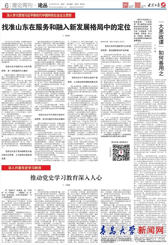 校黨委書記胡金焱在《大眾日報》發表理論文章“找準山東在服務和融入新發展格局中的定位”