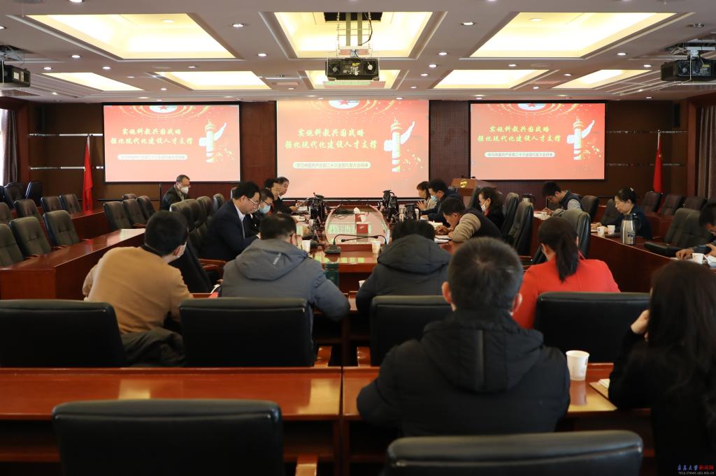 新聞網訊 12月1日下午,校長夏東偉在辦公樓407會議室為校部第二黨總支全體黨員和教職員工宣講黨的二十大精神,作題為《實施科教興國戰略,強化現代化建設人才支撐》的專題報告。報告會采取線上線下相結合的形式,報告會由總支書記孫衛國主持。