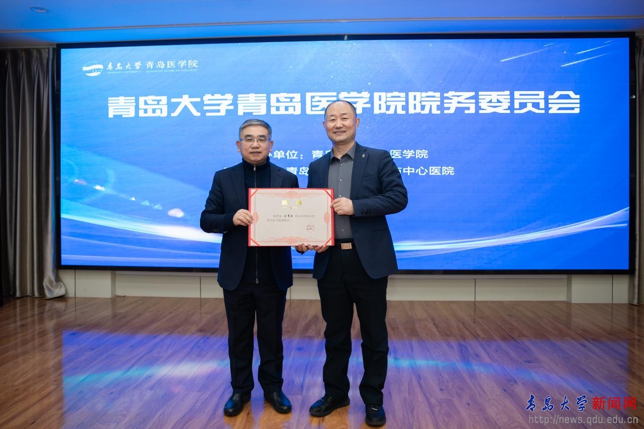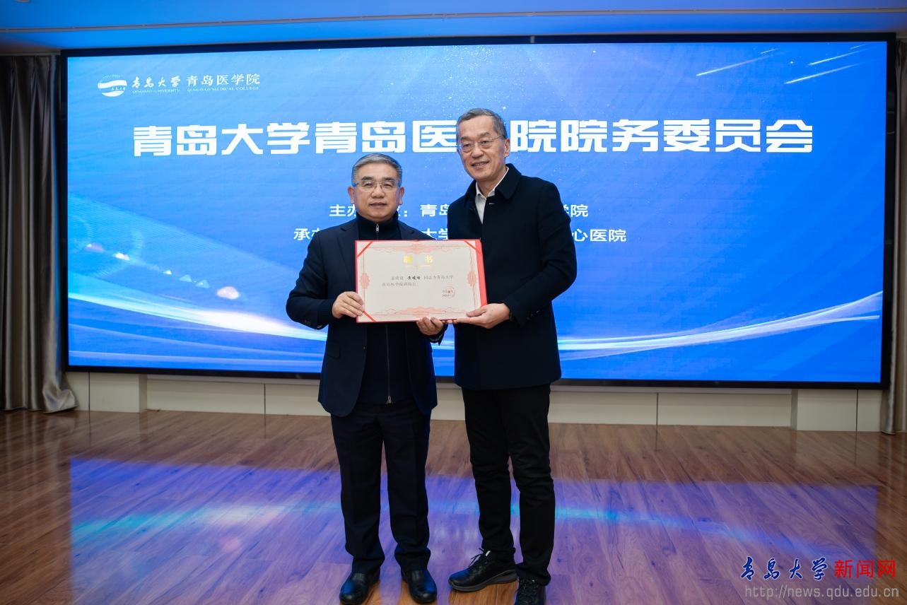 會前,李榮貴宣讀《關于調整青島大學青島醫學院院長、副院長聘任及院務委員會的通知》。胡金焱為新任院長、副院長頒發聘書。