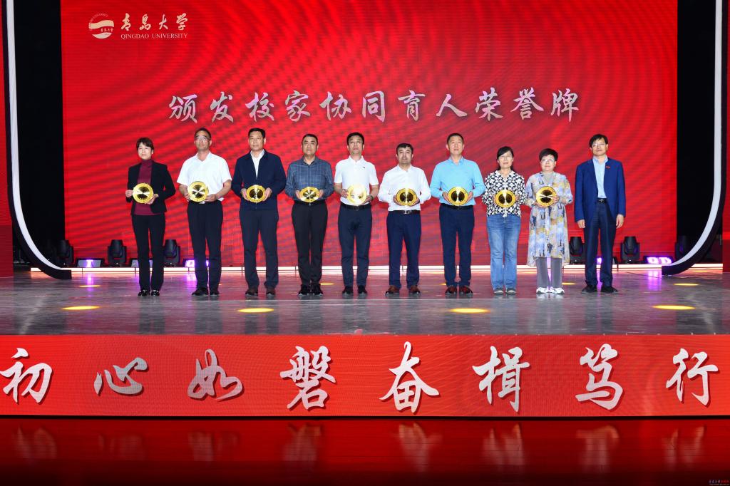 校黨委書記胡金焱為青島中仁健康產業集團有限公司等7家企業頒發“校企協同育人榮譽牌”,充分肯定企業勇擔社會責任,在構建校企人才共育格局上作出的貢獻。校長魏志強為9名獲獎學子的家長頒發“校家協同育人榮譽牌”,對家長與學校同心協力,密切配合,共育英才表示感謝。