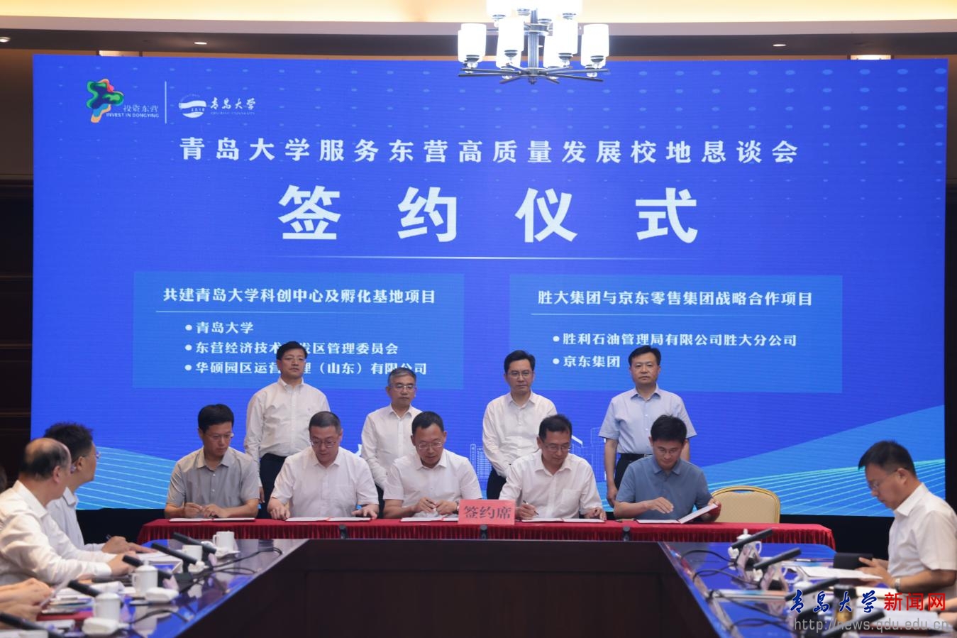 在胡金焱、魏志強(qiáng)、陳必昌、何憲卓見證下,雙方舉行了“共建青島大學(xué)科創(chuàng)中心及孵化基地項(xiàng)目”、“青島大學(xué)與勝大集團(tuán)合作協(xié)議”、“東營青東科創(chuàng)有限公司與東營高新技術(shù)產(chǎn)業(yè)開發(fā)區(qū)管理委員會(huì)共建青島大學(xué)東營研究院合作協(xié)議”、“青島大學(xué)與東營職業(yè)學(xué)院科研成果轉(zhuǎn)化合作協(xié)議”、“青島大學(xué)生命科學(xué)學(xué)院與勝利石油管理局有限公司勝大分公司合作協(xié)議”等項(xiàng)目和協(xié)議的簽署。