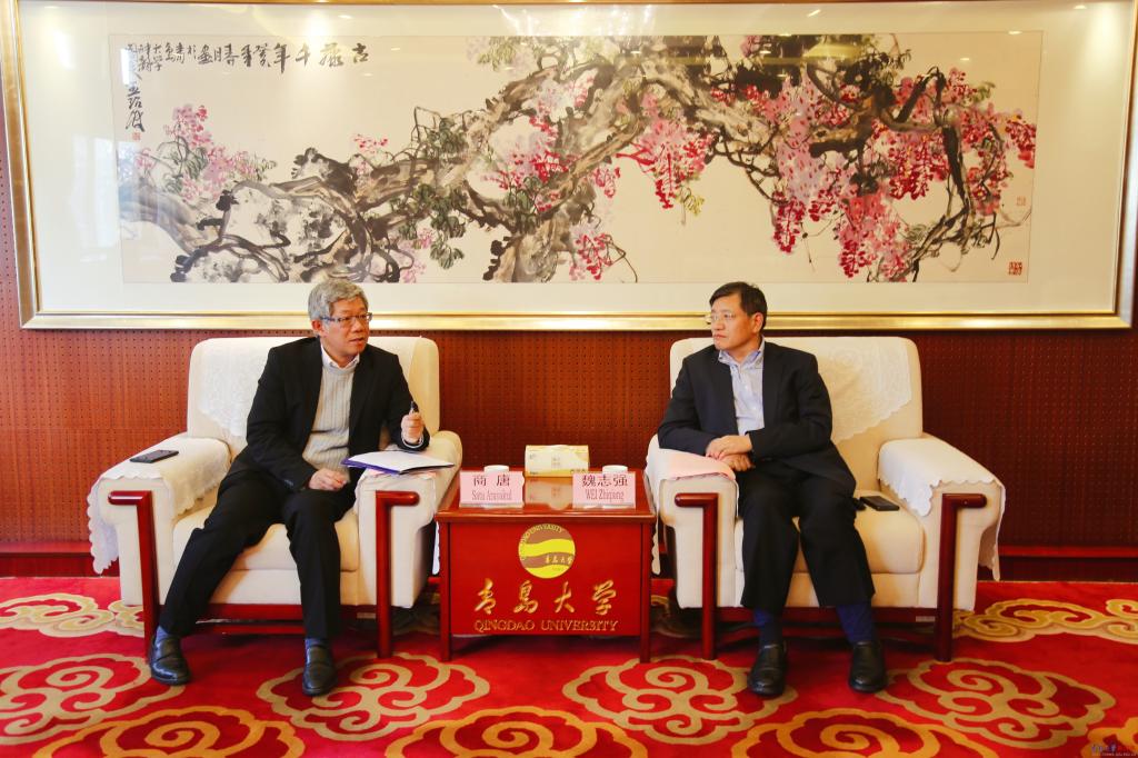 魏志強對商唐總領事的到訪表示歡迎,他用“歷史長、學科全、特色強、規模大和發展快”五個特點概括介紹了青島大學的歷史沿革、學科建設、辦學規模和國際排名等方面的情況,并重點就醫學、紡織以及教育三大板塊進行了詳細介紹。他說,中泰兩國地緣親近,人文交流密切,“中泰一家親”深入人心。青島大學歷來十分重視與泰國高校的交流合作,在泰國總領事館的關心和支持下,先后與泰國藝術大學和泰國清邁大學建立了友好關系,人員交流頻繁。他表示,明年是中泰建交50周年,希望以此次會談為契機,在人文交流基礎上,進一步深化與泰國清邁大學等高水平大學在醫學、紡織和教育等學科領域的科研合作。