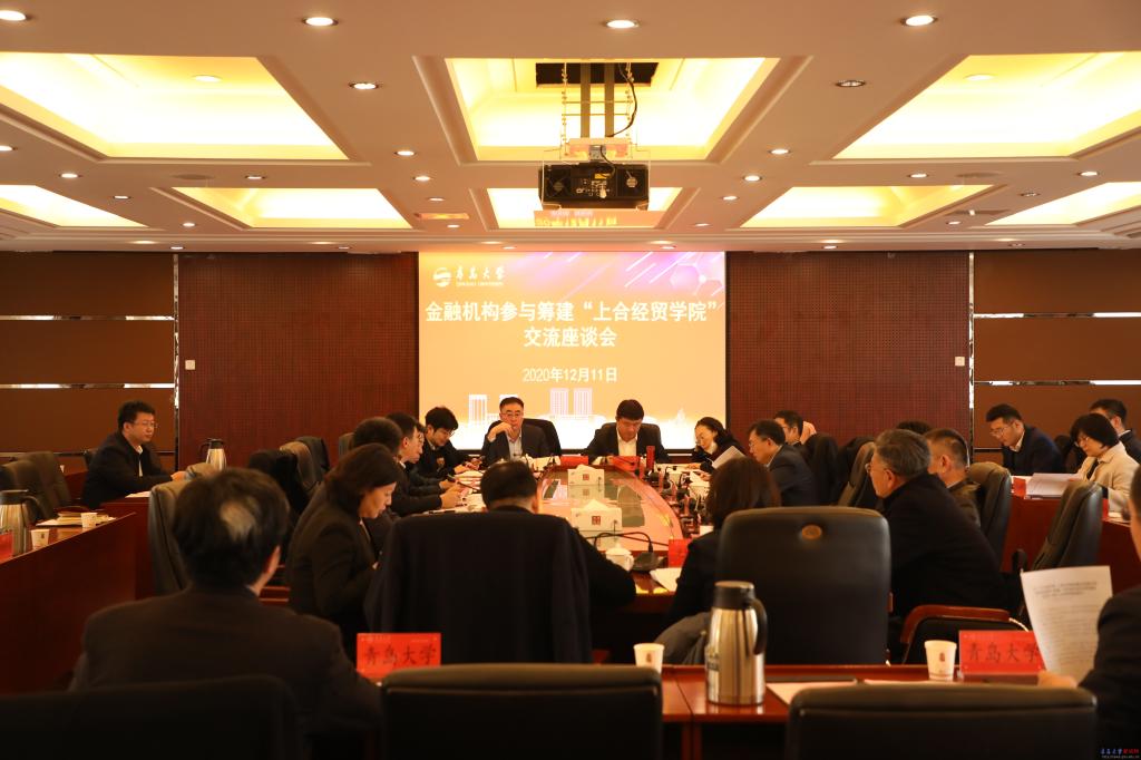 新聞網訊 12月11日上午,金融機構參與籌建“上合經貿學院”交流座談會在學校行政樓第一會議室舉行。上合示范區黨工委委員、管委會副主任、上合經貿學院推進工作領導小組副組長孟慶勝,青島市教育局總督學尹明琴,青島市地方金融監管局副局長王志斌,校黨委副書記、上合經貿學院工作委員會副主任杜方波出席座談會。青島市各金融機構相關負責同志參加座談會,座談會由孟慶勝主持。