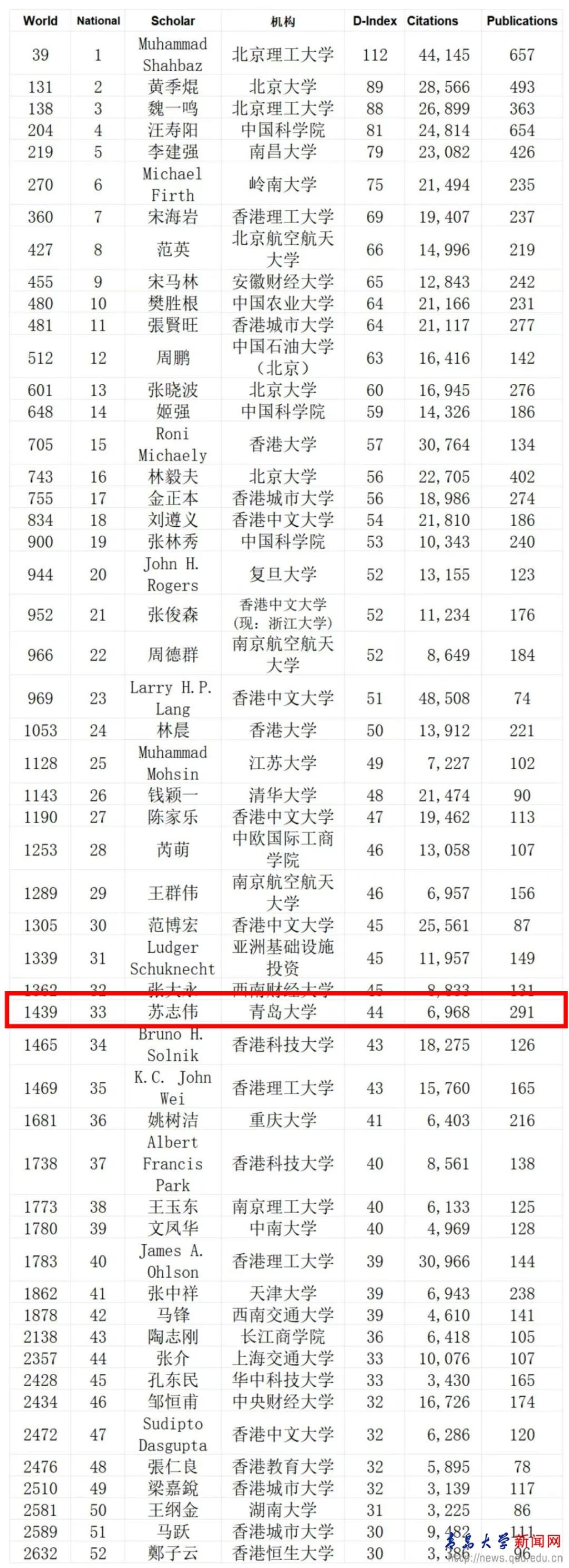 通過對10067名經濟金融領域的學者分析發現,中國有52名學者入選,與上一版的排名相比,增加了10位學者。我校經濟學院蘇志偉教授入選經濟金融領域頂尖科學家名單,位列第33位。