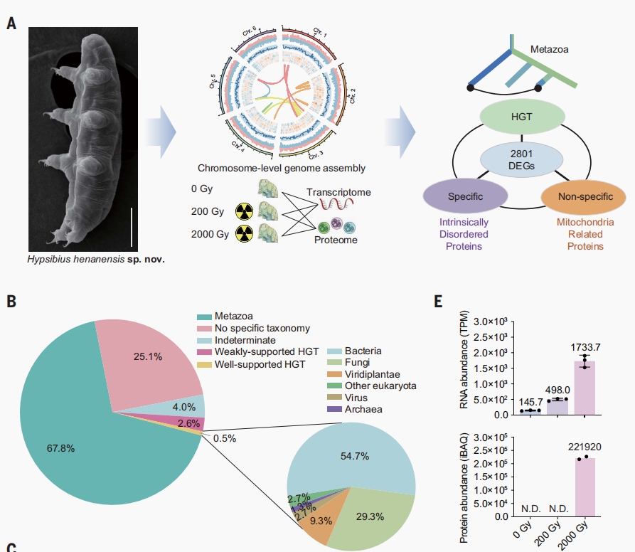 新聞網訊 近日,我國科學家基于水熊蟲的多組學和抗輻射機制研究取得重要突破。軍事科學院軍事醫學研究院張令強團隊和楊冬團隊,聯合陜西學前師范學院王立志等國內其他相關研究團隊,經過6年多潛心研究,發現并成功建立河南高生熊蟲的實驗室培養體系,繪制其高質量基因組圖譜,結合轉錄組、蛋白質組響應輻射的動態變化及關鍵分子功能和機制研究,揭示了耐受超強輻射的關鍵機制。研究成果以research article形式發表在國際頂級期刊Science雜志。 我校基礎醫學院免疫學專業2020級碩士研究生葛正平為共同一作(共一第二位,導師張令強研究員),青島大學基礎醫學院為第二完成單位。