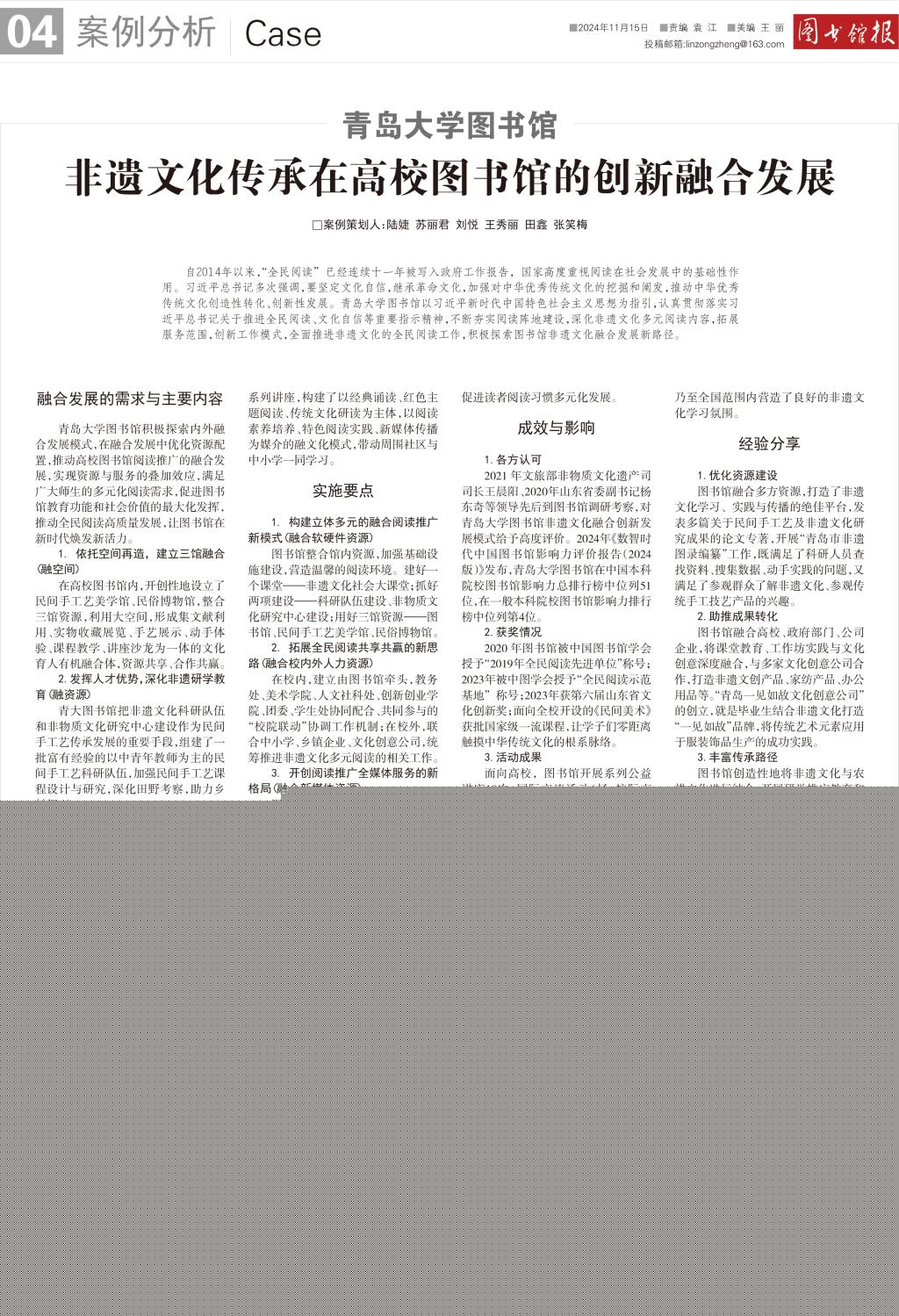 新聞網訊 近日,《圖書館報》總第718期第4版整版刊發我校圖書館題為《非遺文化傳承在高校圖書館的創新融合發展》的文化創新案例。該案例由我校圖書館黨委書記、館長陸婕帶領團隊完成,今年5月入選該報“2024圖書館融合發展典型案例”。