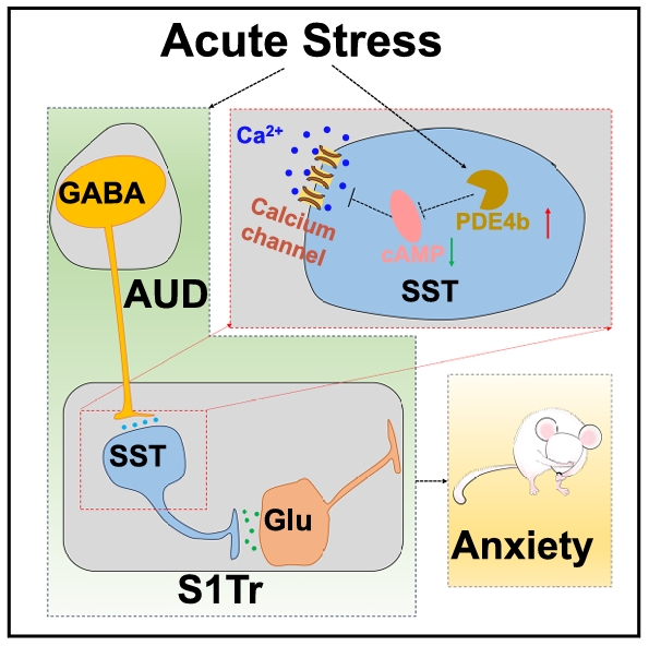 焦慮是一種復雜的情緒,表現為面對不確定性時過度緊張、擔心或恐懼。通常,當哺乳動物遇到急性應激刺激時,它們會產生暫時的焦慮情緒,以維持維持注意力、應對新出現的威脅和挑戰、避免重復暴露于危險情況所需的警惕性和喚醒性。以往的研究主要集中在將壓力與焦慮聯系起來的神經回路上,急性壓力如何調節神經回路從而導致焦慮的潛在機制尚不充分。初級體感皮層(S1)是大腦的體感中樞,在疼痛和焦慮行為的處理中起著關鍵作用,之前的研究表明S1神經元在焦慮的調節中起重要作用。目前為止,S1神經元是否能夠參與急性應激性焦慮尚不清楚。該研究證明急性應激可以激活S1TrSst神經元,導致它們在隨后的類焦慮行為測試中產生低活性效應,最終導致類焦慮行為,并提供一系列證據,證明參與急性應激性焦慮的S1TrSst神經元接受來自AUD中GABA能抑制神經元的輸入。他們發現,急性應激后,AUDGABA-S1TrSst神經回路中的幾種PDEs上調,導致cAMP信號通路活性降低,因此,減少由AUDGABA輸入的S1TrSst神經元中的Pde4b蛋白可以逆轉急性應激誘導的焦慮樣行為和神經元脫敏。該項研究為急性應激性焦慮的神經回路和分子機制提供了新的見解。