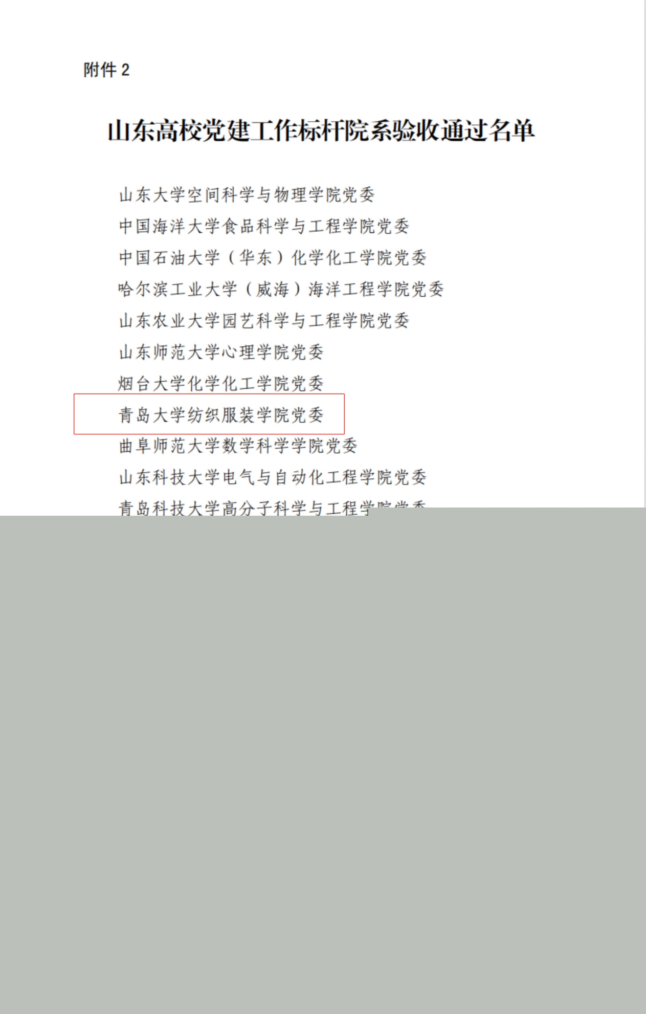 新聞網訊 近日,山東省委教育工委公布了第二批山東高校黨建“雙創”培育創建工作驗收通過名單,我校紡織服裝學院黨委、公共衛生學院勞環衛與衛生毒理學黨支部、人民武裝部黨支部三個黨組織順利通過驗收。