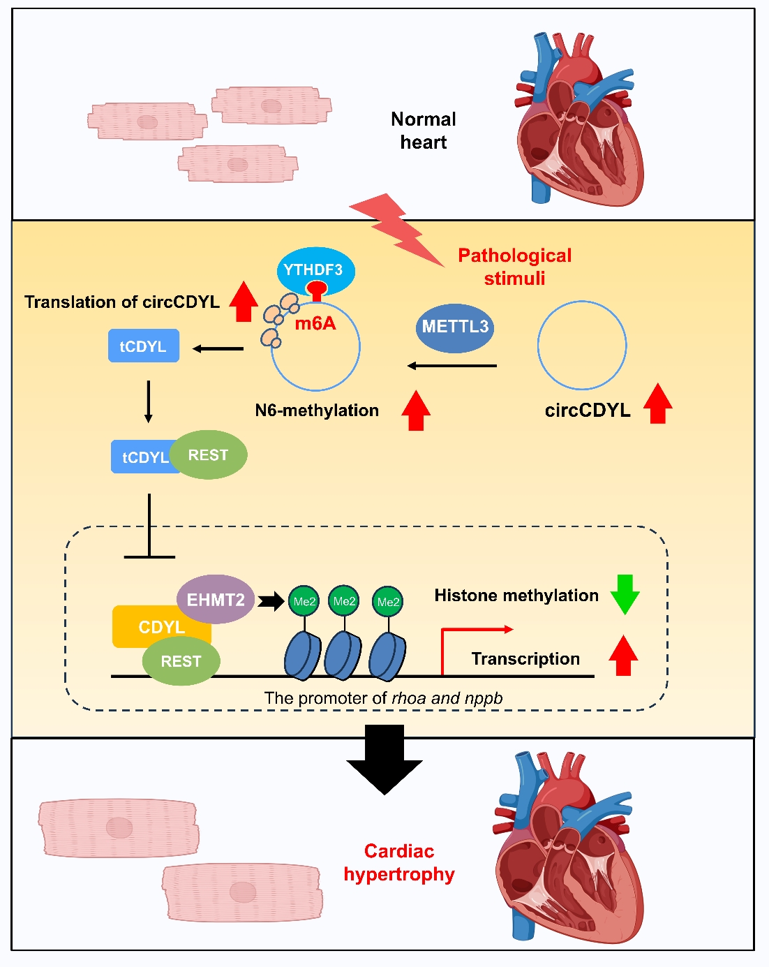 病理性心肌肥大是心肌在不良影響下的一種代償性變化,若無法獲得有效治療最終將發展為不可逆的心力衰竭。該研究從高通量數據中篩選出了在物種中保守同時與病理性心肌肥大高度相關的環形RNA-circCDYL,并通過細胞水平實驗證明了circCDYL能夠直接導致心肌細胞肥大。在機制方面,研究發現病理刺激可上調circCDYL的表達并激活心肌細胞中的甲基轉移酶METTL3對circCDYL進行m6A修飾。在受到修飾后CircCDYL可招募YTHDF3啟動翻譯、產生一種名為tCDYL-100的多肽。該多肽的氨基酸序列與CDYL(Chromodomain Y-like)蛋白高度重合,能夠與CDYL競爭結合轉錄抑制因子REST(RE1-silencing transcription factor)并阻止REST、CDYL以及EHMT2(Euchromatic histone-lysine N-methyltransferase 2)形成轉錄抑制復合體,從而降低促肥大基因rhoanppb啟動子區域組蛋白甲基化修飾水平、導致轉錄的激活。在體研究結果顯示,在動物水平特異性沉默心肌中的circCDYL可有效抑制Ang II引起的心肌肥大和心功能破壞,而在心肌中過表達tCDYL-100可直接造成病理性心肌肥大并損害心功能,從而驗證了circCDYL-tCDYL在病理性心肌肥大發展中的重要作用。