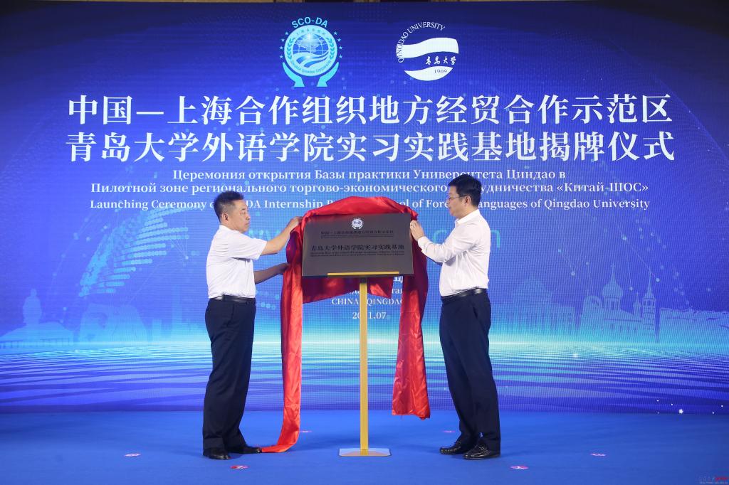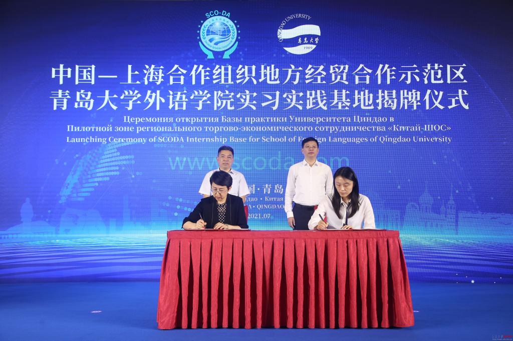 儀式上,杜方波、孟慶勝、外語學(xué)院黨委書記王傳永、膠州市委宣傳部副部長趙法文、膠州融媒體中心副主任任獻(xiàn)文共同啟動上合示范區(qū)五語種官方網(wǎng)站上線(試運行),卞建華與上合示范區(qū)管委商旅文化部部長夏鵬共同簽署了共建實習(xí)實踐基地協(xié)議,杜方波與孟慶勝共同為青島大學(xué)外語學(xué)院實習(xí)實踐基地揭牌。