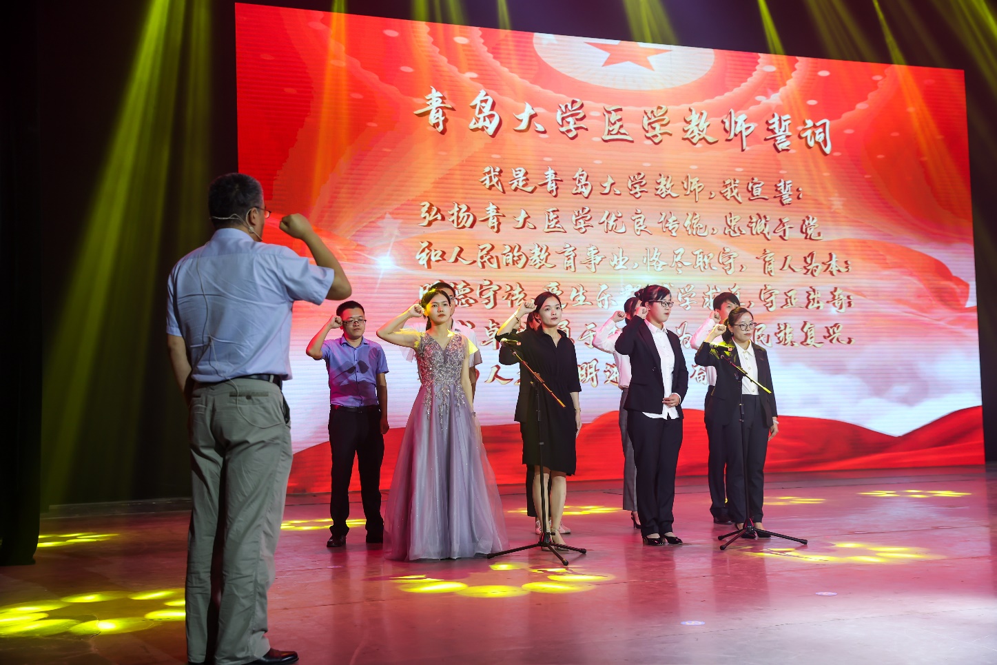 會議最后,由金立新教授領(lǐng)誓,帶領(lǐng)10位新入職教師代表及在場全體教師宣讀青島大學醫(yī)學教師誓詞,廣大教師在雄渾有力的誓言聲中再次堅定育德育人的師心。