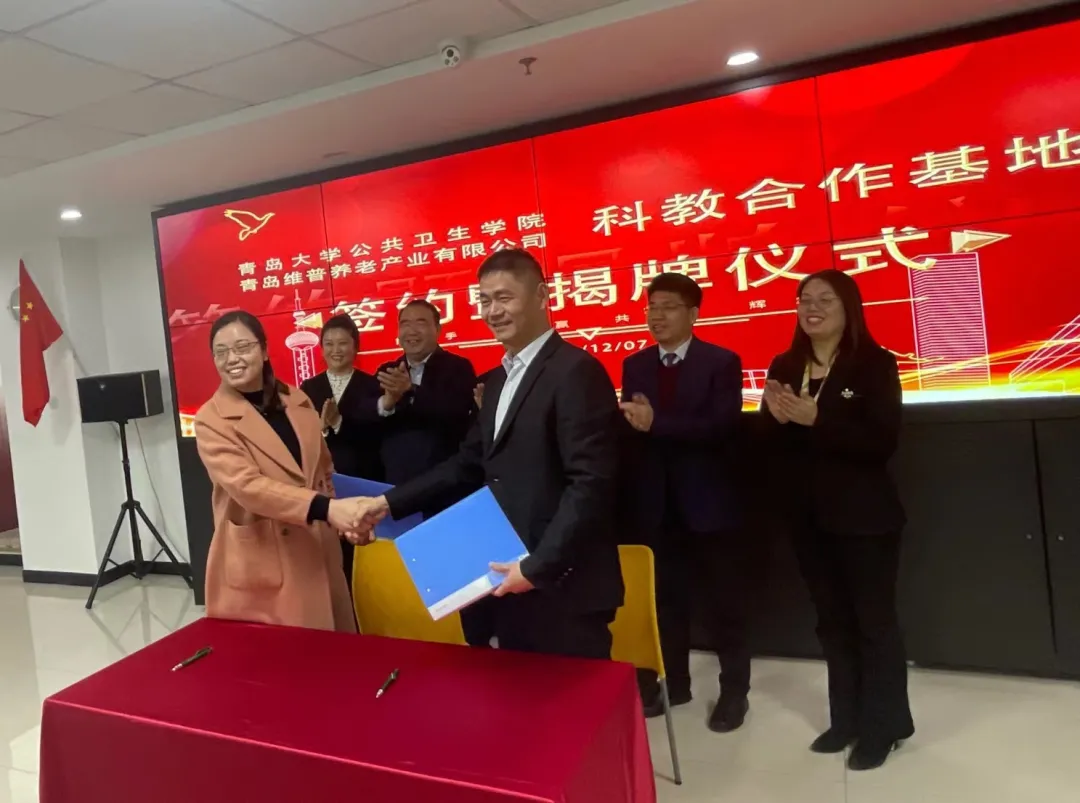 新聞網訊 12月8日上午,“青島大學公共衛生學院科教合作基地”簽約暨揭牌儀式在青島維普養老產業有限公司舉行。雙方代表共同簽署了科教合作基地合作協議,并為“青島大學公共衛生學院科教合作基地”揭牌。