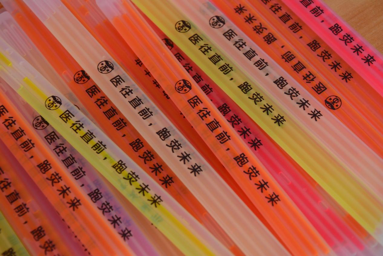 活動當天,工作人員給學生發放熒光棒,并提前擺好“請黨放心 強國有我”“I?QDU”“醫夢為馬 考研加油”等字樣。雨后的微風雖帶著涼意,卻難掩大家的積極與熱情,隨著開跑指令發出,200余名參與學生相攜出發,夜幕中的操場熒光閃耀,奔跑的人群在跑道上形成了亮麗的風景線。
