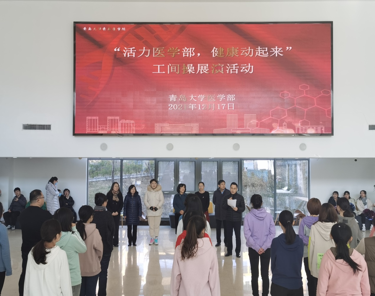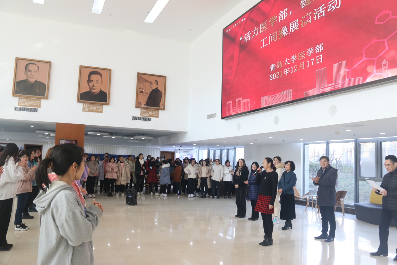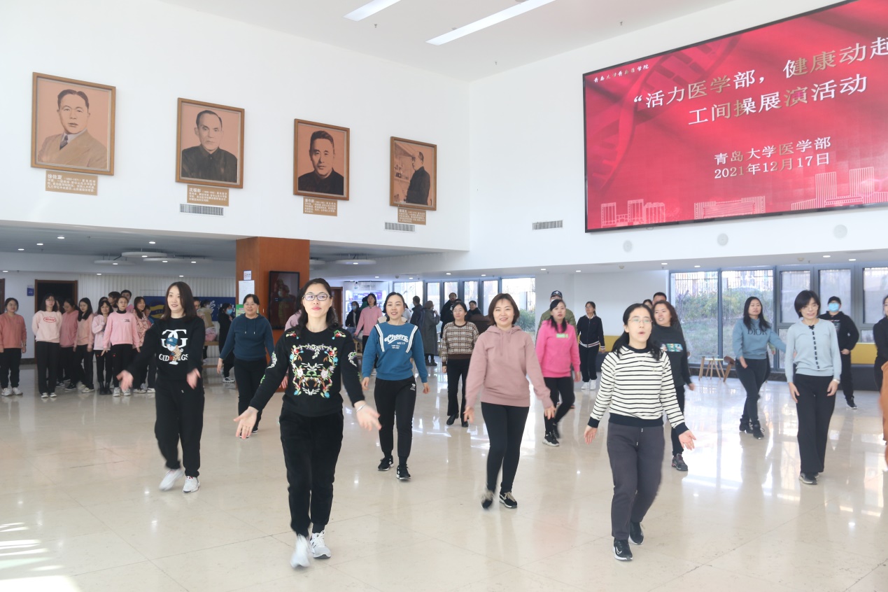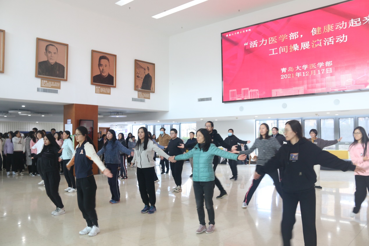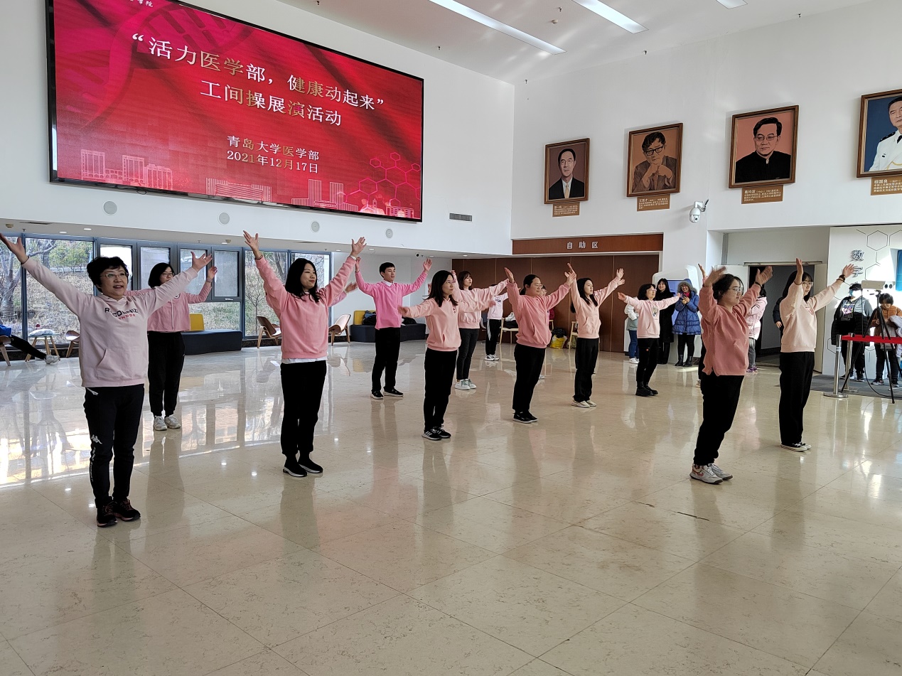 醫學部工會安排專人在10月14號參與了由青島市總工會專家來校舉行的工間操培訓,之后在整個醫學部組織開展工間操培訓教學。教師們錄制了分解動作發放給各分工會,每周進行不少于2次的集中線下集體訓練。兩個月的時間,老師們通過對視頻反復觀看和線下刻苦練習,醫學部共有500余名教師參加了此次工間操展演活動的選拔,年齡跨度從60后到95后,展演當天200余名教職工參演,充分展現了醫學部教職醫務員工積極健康的精神風貌和凝聚向上的團隊精神。教職工們紛紛表示,做工間操既鍛煉了身體、愉悅了身心,又提高了工作效率,希望能夠長期堅持。