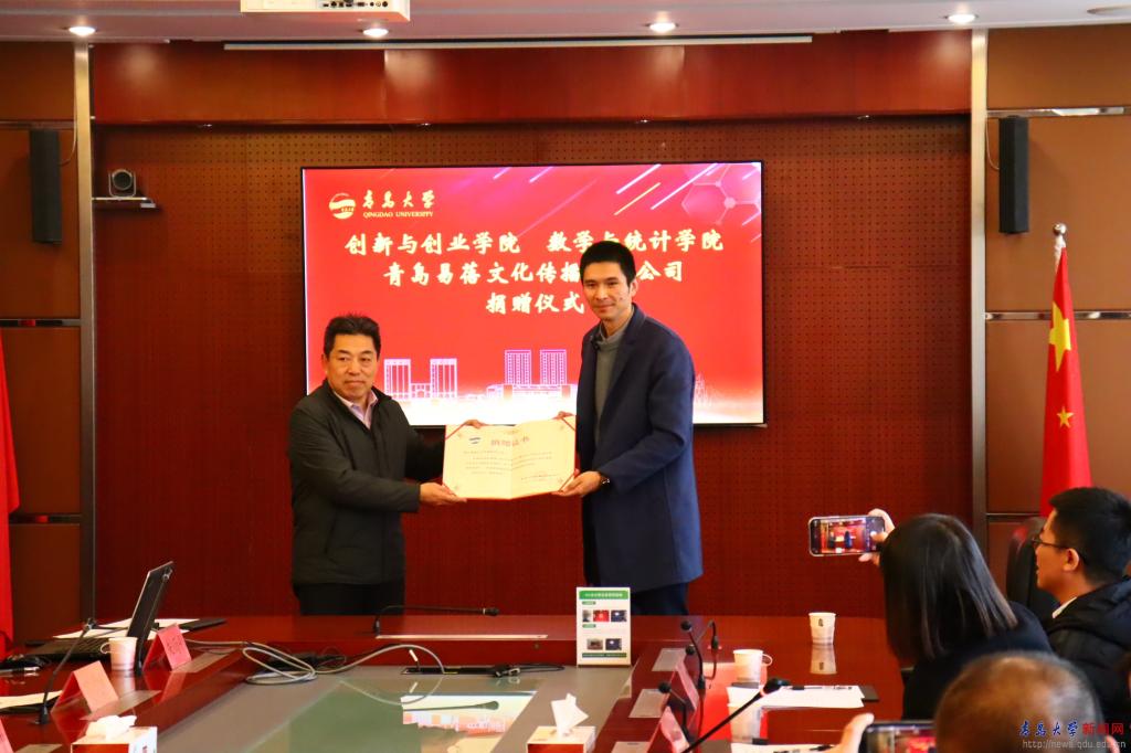 青島易蓓文化傳播有限公司、學校合作發展處、學校教育發展基金會、數學與統計學院、創新與創業學院等相關單位負責人參加捐贈儀式。