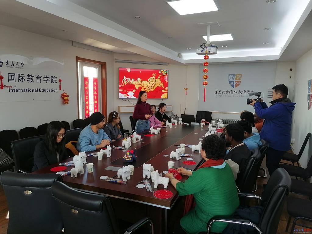 新聞網(wǎng)訊 在農(nóng)歷虎年即將到來之際,我校來自8個國家的12名外國留學生齊聚一堂,共話新春,共同喜迎虎年的到來。國際教育學院領導老師向留學生們贈送了虎年窗花,并表達了新年美好的祝福和問候。隨后來自青島大學美術學院的民俗愛好者為留學生們帶來了精彩的現(xiàn)場授課,講解了春節(jié)的傳統(tǒng)習俗,分享并演示了泥老虎繪制過程。