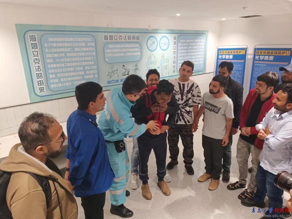 現場,留學生們在專業人士的指導下了解了反邪教宣傳、反電詐教育、禁毒教育、消防安全、醫療救護、防溺水體驗、交通安全、校園安全等安全教育知識,學習了心肺復蘇術、海姆立克法、簡易結繩方法等應急安全知識,并進行了高層模擬逃生緩降體驗。留學生們通過體驗式、沉浸式的安全學習,進一步增強外國留學生的防災減災意識,學習安全應急知識,提升應急避險自救的能力。