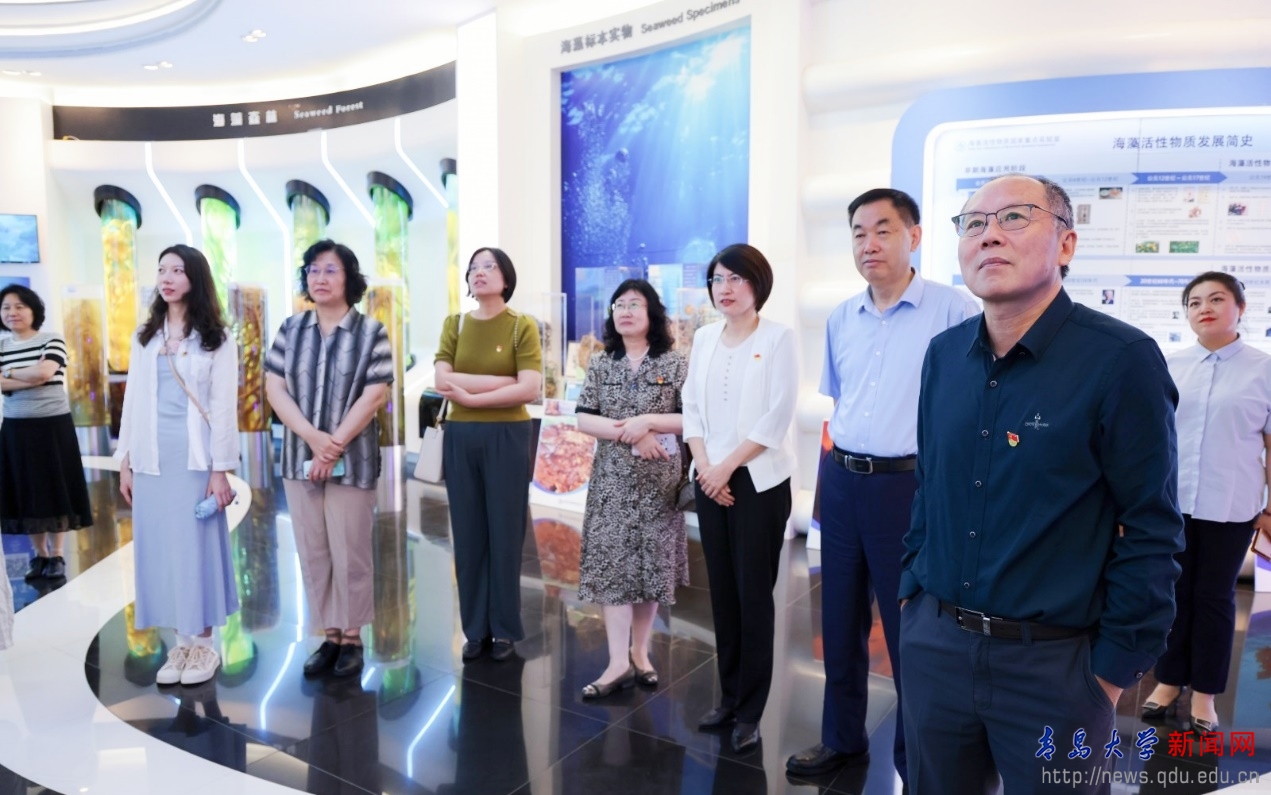 在青島明月海藻集團,集團黨委書記、董事長張國防,副總裁張德蒙,黨委副書記、明月五彩文旅集團副總裁楊曉菁等領導班子成員陪同公共衛生學院黨委理論學習中心組成員、系主任、支部書記、教師代表考察了中國海藻生物科技館、明月海藻集團科技館、海洋食品加工與安全控制全國重點實驗室,以及黨建文化廣場。