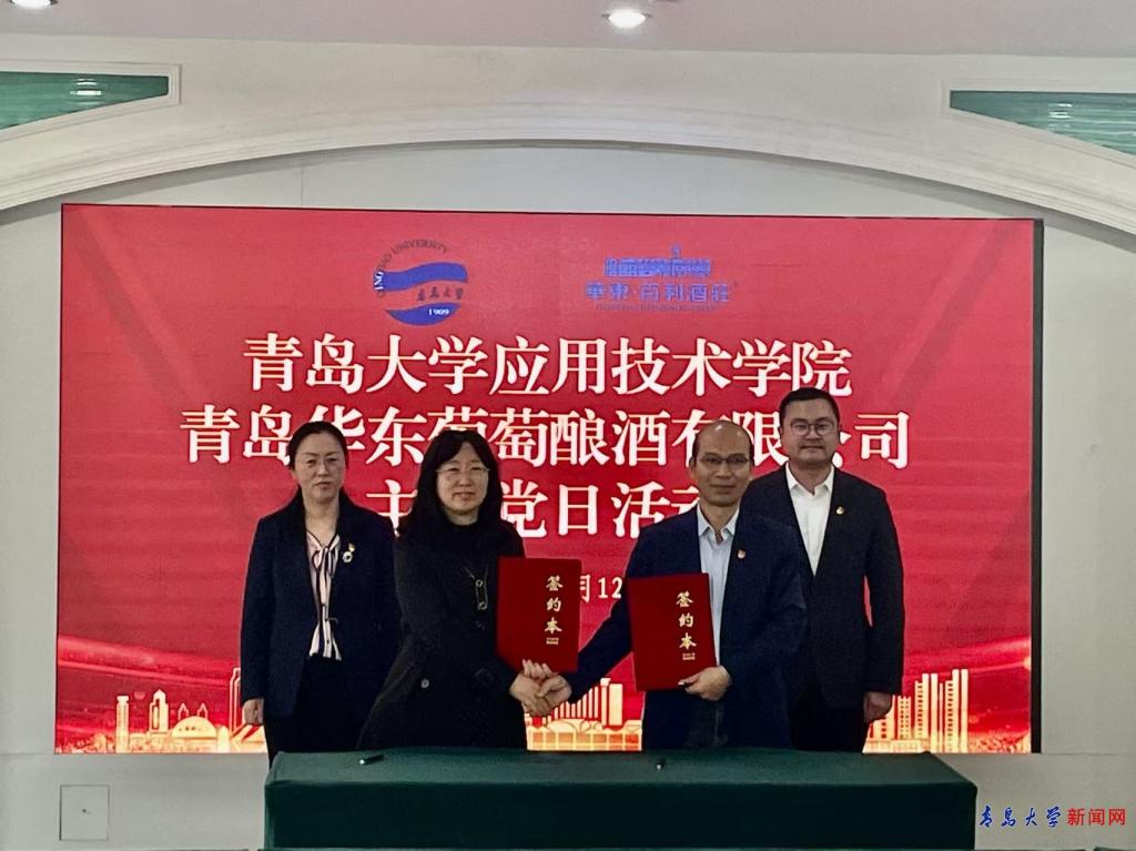 耿寶福、嵇可琳簽署了《青島大學與青島華東葡萄釀酒有限公司教育培訓基地合作協議書》,張燕、魏帥強為青島大學—青島華東葡萄釀酒有限公司教育培訓基地揭牌。應用技術學院教工第二黨支部書記初秀榮、青島華東葡萄釀酒有限公司第一黨支部書記劉春生簽署了《黨建共建協議書》。
