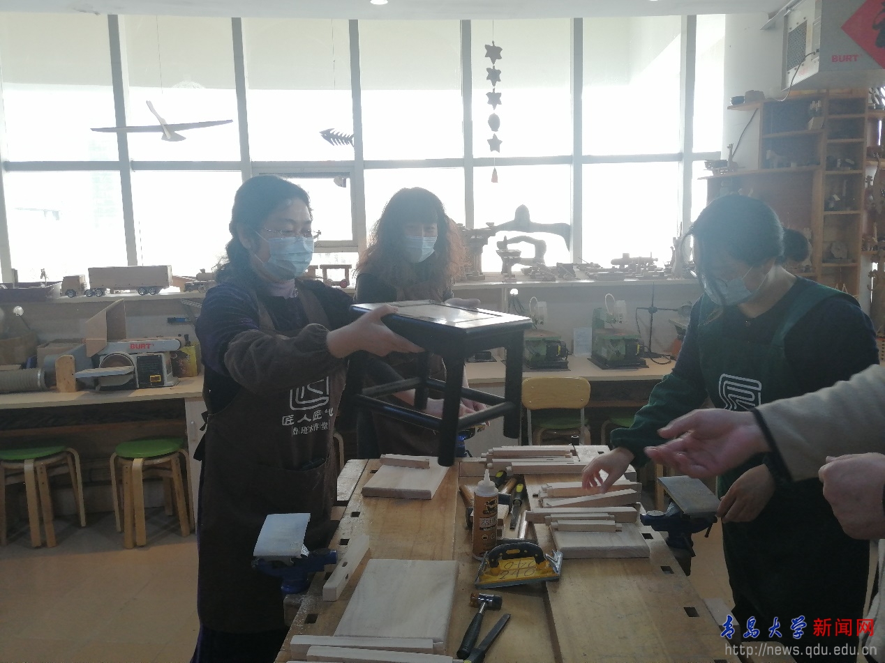 本次活動中,學院教職工走進“魯班木作堂”,在木工專家的講解指導下親手制作木工小板凳。通過木塊打磨、榫卯拼接、乳膠加固、插接成型、后期修整等工藝流程,大家都成功地完成了自己的作品。