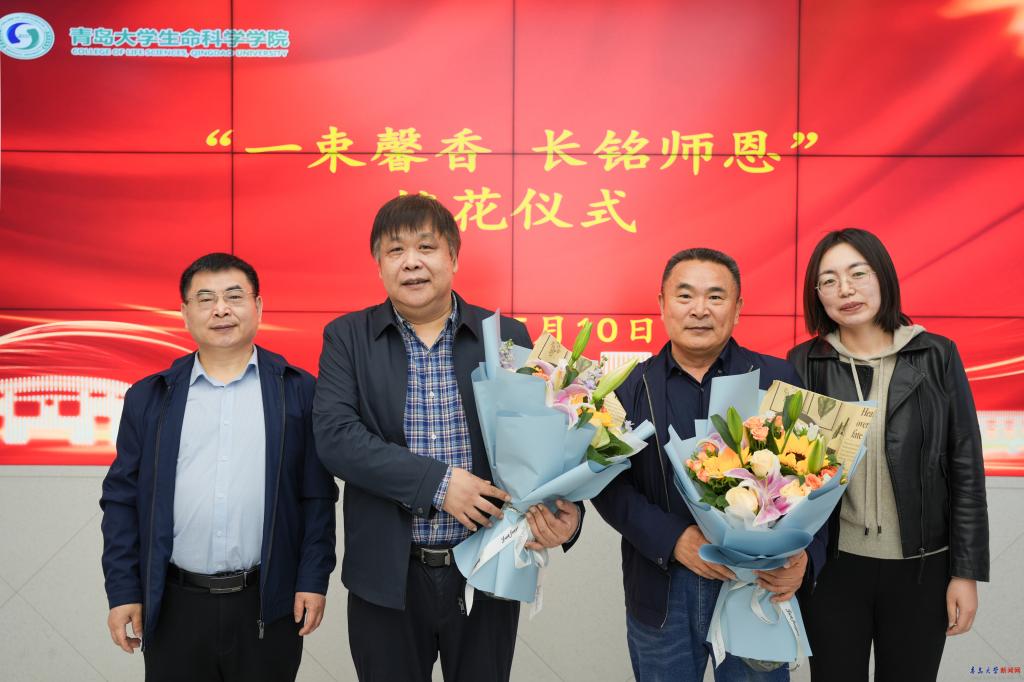 陳建鋒、趙玲代表校友向李榮貴、魏玉西獻(xiàn)花,感謝他們對學(xué)生的精心培養(yǎng)。