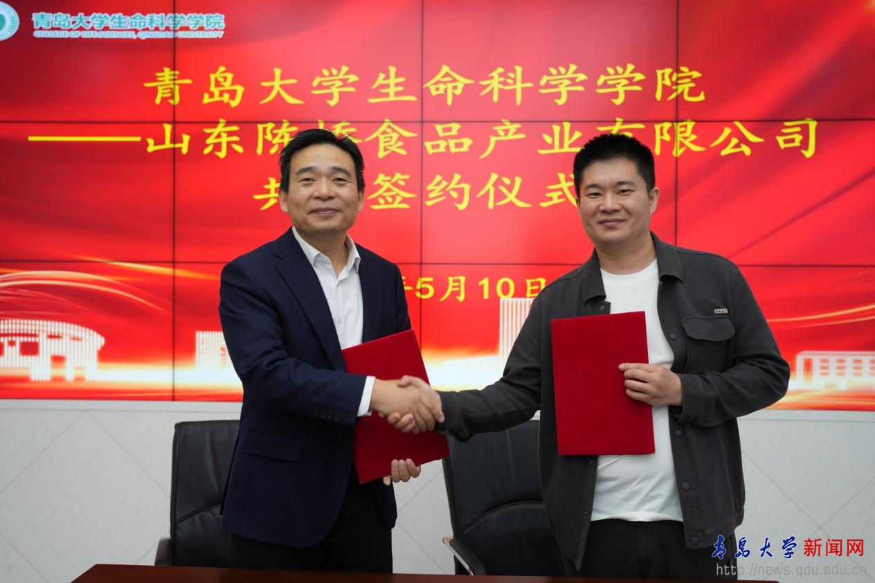 學(xué)院校友、山東陳橋食品產(chǎn)業(yè)有限公司董事長宋傳新與生命科學(xué)學(xué)院院長孫海新簽署了校企合作協(xié)議。