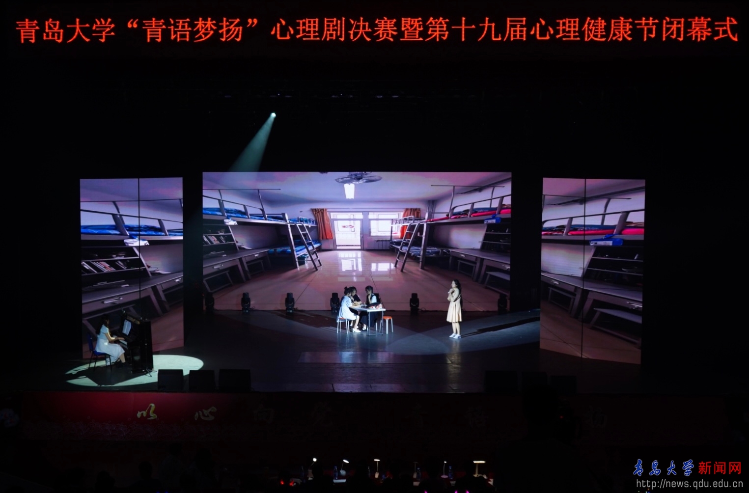 新聞網訊 6月11日,青島大學第六屆“青語夢揚”心理劇決賽暨第十九屆心理健康節閉幕晚會在青島劇院成功舉行。校黨委常委、副校長劉彩云、相關職能部門領導、輔導員、心理教師和學生代表共計400余人參加了晚會。
