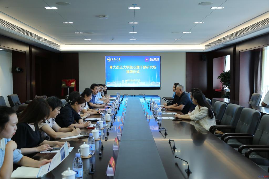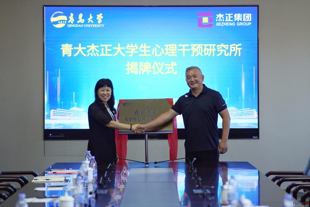 會上,學生處處長解濤和杰正投資集團有限公司總裁助理楊詠梅代表校企雙方簽署了《青大杰正大學生心理干預研究所執行協議》。劉彩云和方海暉共同為“青大杰正大學生心理干預研究所”揭牌。