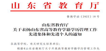為深入學習貫徹黨的十九大和十九屆歷次全會精神,激勵工作、樹立典型,2022年春季學期,山東省教育廳開展了山東省高等教育學籍學歷管理工作先進集體和先進個人評選工作。全省高等學校(含成人高校)、普通本專科(高職)教育、研究生教育、成人教育、網絡教育學籍學歷管理工作部門與相關工作人員參與了評選。