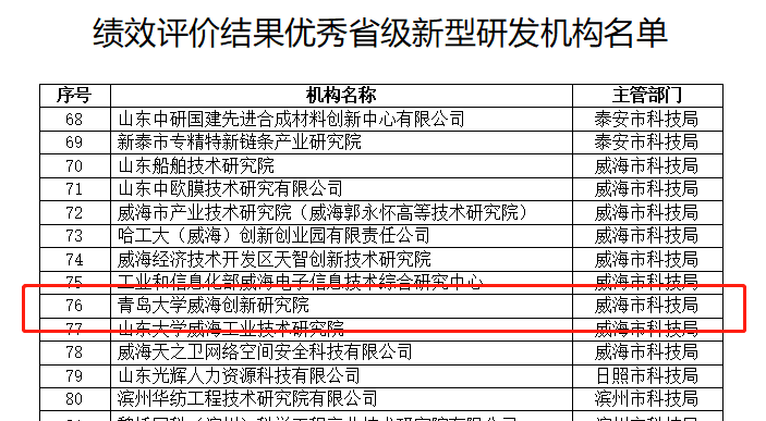 新聞網訊 近日,山東省科技廳公示2022年度省級新型研發機構績效評價結果,我校威海創新研究院再次榮獲省級新型研發機構績效評價“優秀”等次。本次考評,全省共有89家省級新型研發機構績效評價結果優秀,其中,威海全市占9家。