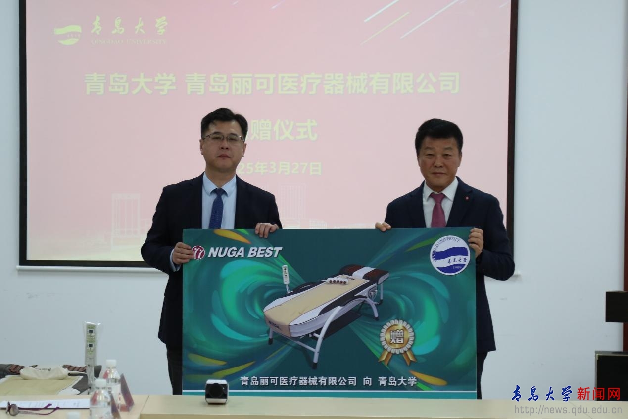 在全體嘉賓的見證下,崔熙準代表青島麗可醫療器械有限公司向青島大學交付“自動溫熱組合醫療器”,牛海濤代表學校接受捐贈,并向崔熙準頒發捐贈證書,表彰企業的公益善舉與社會責任感。