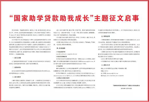 2.除小說外體裁不限,題目不限,字數不限。圍繞“國家助學貸款助我成長”這一主題,集中講述一個人或一件事,要求內容真實,感情真摯,突出人物個性和獨特經歷,傳遞正能量。